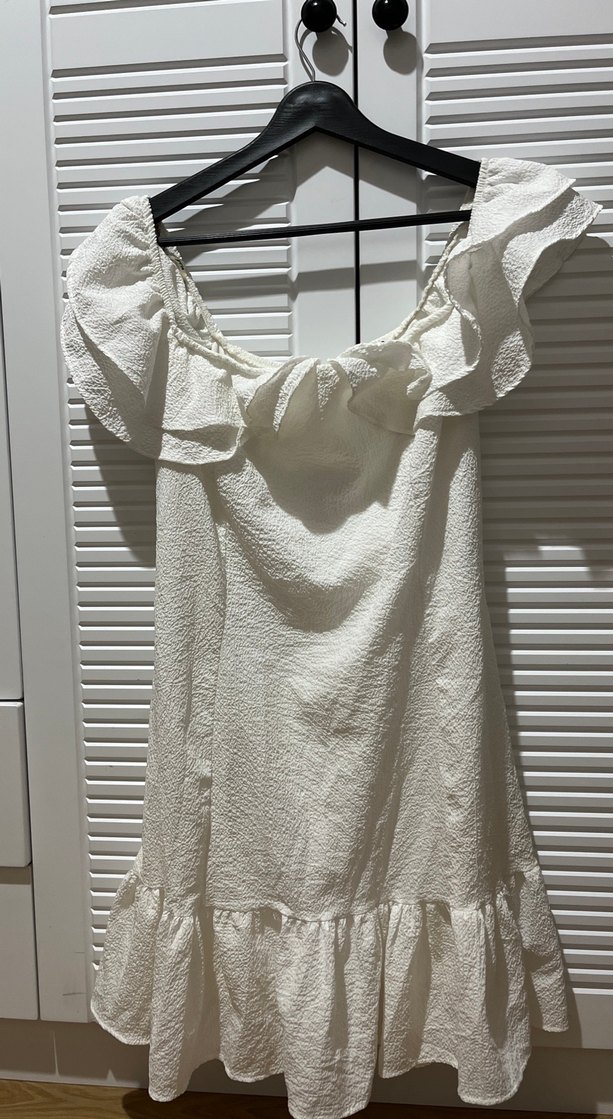 Beyaz keten kumaştan, fırfırlı detaylı, tekne yaka ve kolsuz bohem midi elbise. Rahat kesimli ve günlük kullanıma uygun.