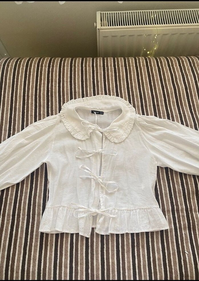 S M uyumlu. Keten kurdele detaylı gömlek, fırfırlı yakalı ve uzun kolludur. Son fotoğrafta gösterdiğim gibi ufak bir defosu var bunun için uyguna satıyorum. Ambar marka.