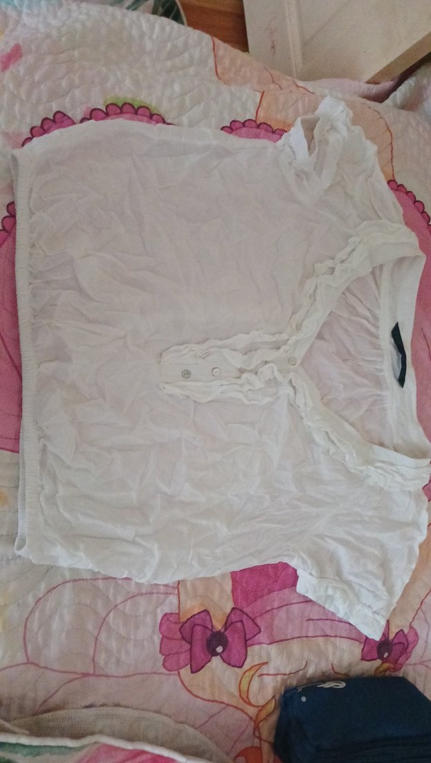 beyaz keten gömlek, kısa kollu, V yaka ve fırfır detaylı, rahat kesimiyle hafif ve ferah bir his sunar.crop tarzı kısa.m beden diyor ama salaş l bedene de uyar