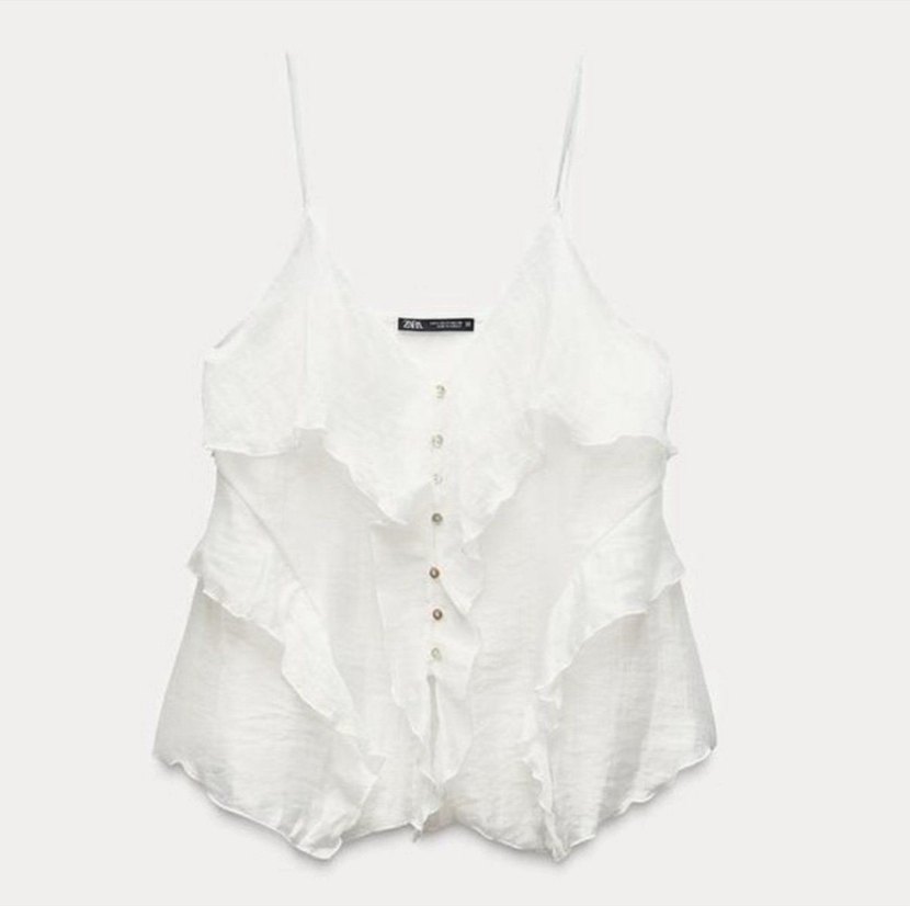 Beyaz keten kumaştan, V yakalı, fırfırlı kolsuz bluz. Bohem tarzı için uygun, hafif ve ferah bir tasarım.
