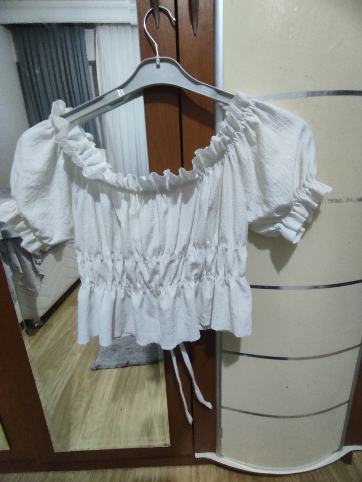 Beyaz keten, fırfırlı, kayık yaka ve kısa ipli kollu bol kesim mini bluz. Bohem tarzda, günlük kullanıma uygun.