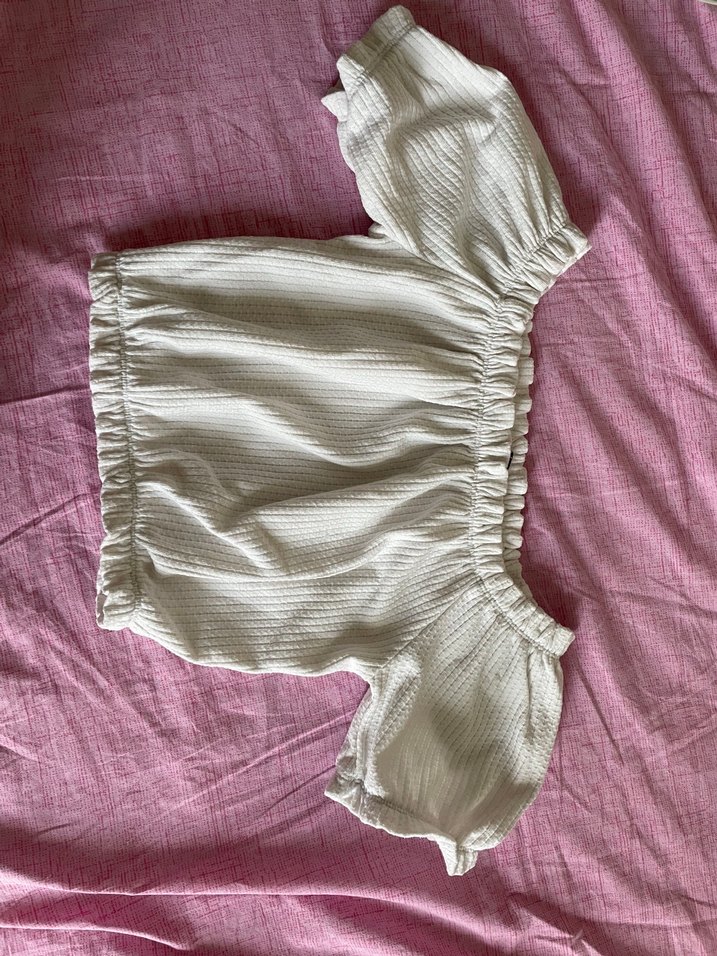 Beyaz keten kumaştan, fırfırlı detaylı, kısa ve fitted kesim mini bluz. Kısa balon kollu ve kayık yaka tasarım bohem tarzda rahat bir görünüm sunar.