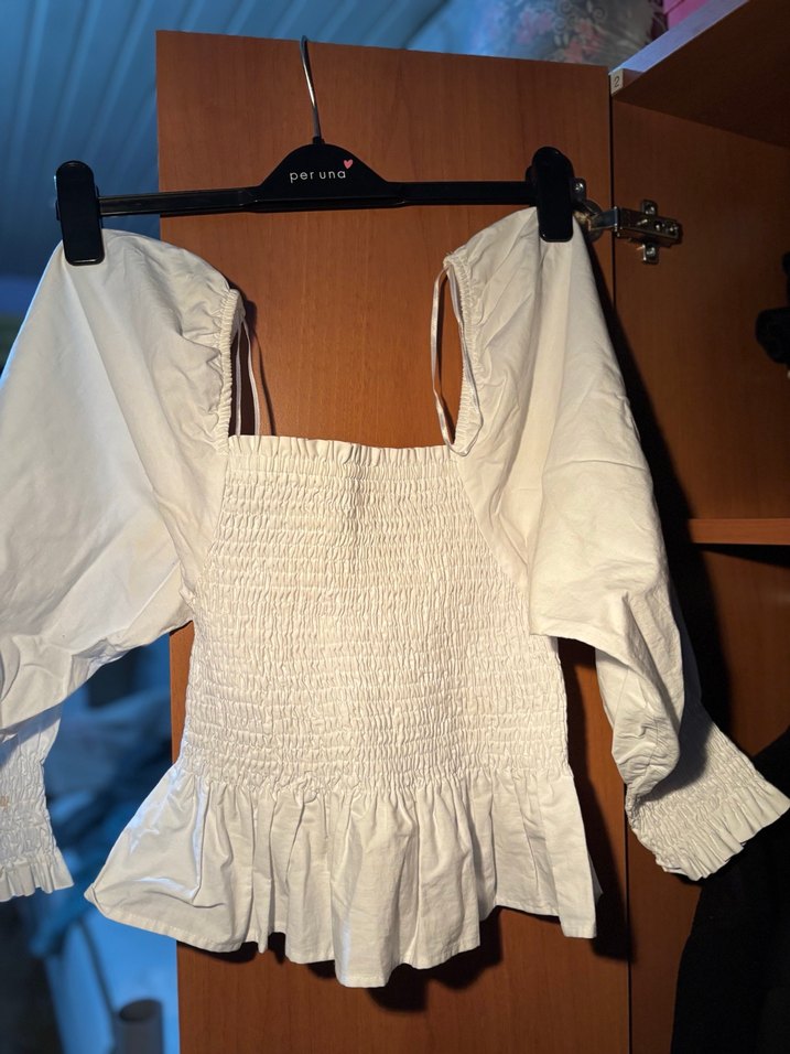 Beyaz keten kumaştan, straplez ve oturan kesim, fırfır detaylı, askılı kollu bluz. Sokak modasına uygun.