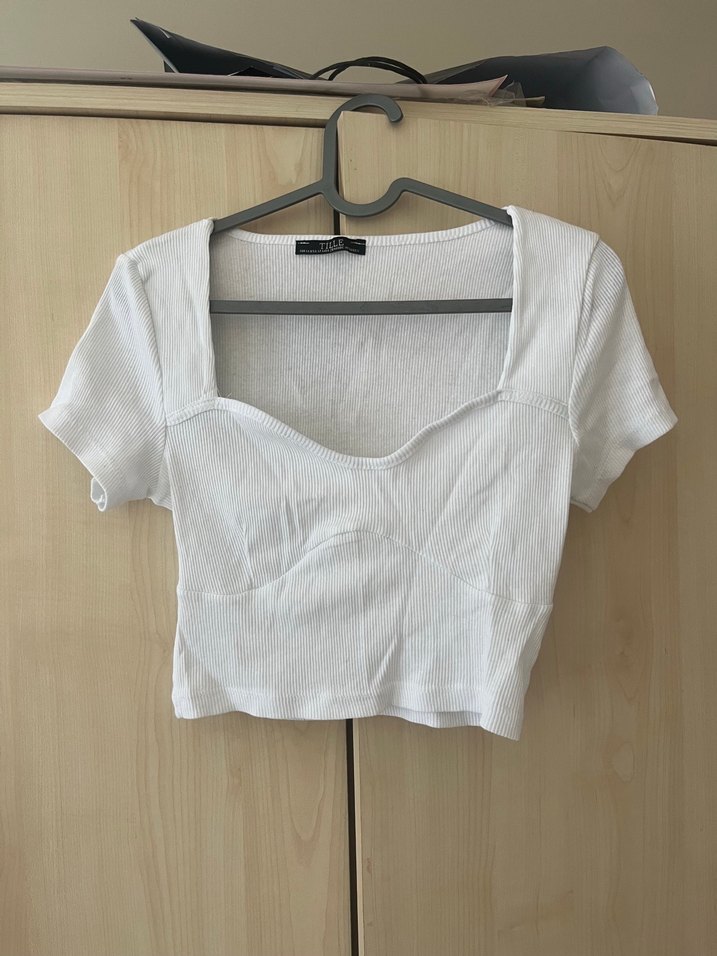 Beyaz keten kumaştan, kısa kollu ve tekne yaka, fitted kesim kadın bluz. Minimalist ve günlük sokak stiline uygun.