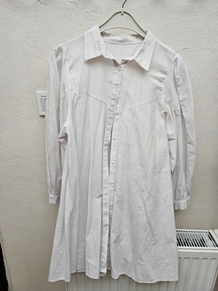 Beyaz keten midi gömlek, düğmeli ve yakalıdır. Uzun kollu, bol kesim bohem tarzda sade ve desensizdir.