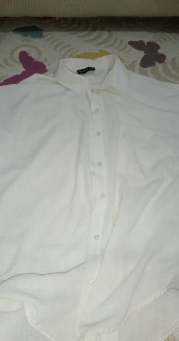 Beyaz keten gömlek, yakalı ve düğmeli önüyle bol kesim, kısa kollu ve normal boydadır. Minimalist, desensiz tasarımı günlük kullanıma uygundur.