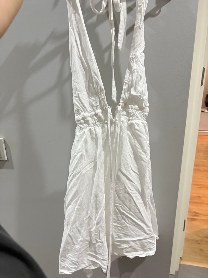 Beyaz keten kumaştan, halter yaka ve ince askılı, drapeli, midi boy, vücuda oturan tulum. Minimalist ve bohem tarz için uygun.