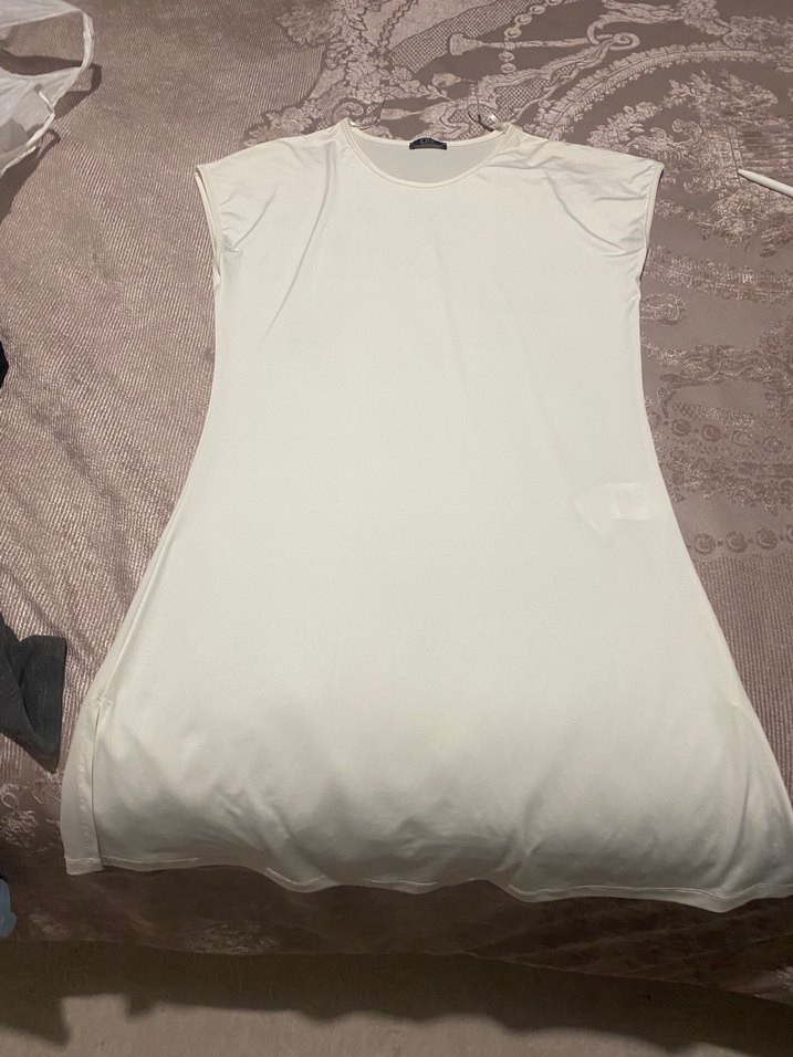 Beyaz keten kumaştan, kısa kollu, tek renk ve sade tasarımlı hamile midi elbise. Tekneden ilham alan yaka ve günlük kullanıma uygun minimal stil sunar.