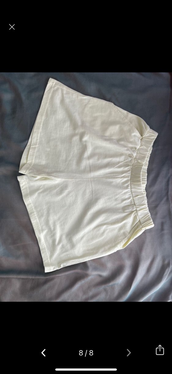 Beyaz keten, bol kesim ve midi boy hamile şortu. Günlük sokak stiline uygun, rahat ve şık bir seçenektir.