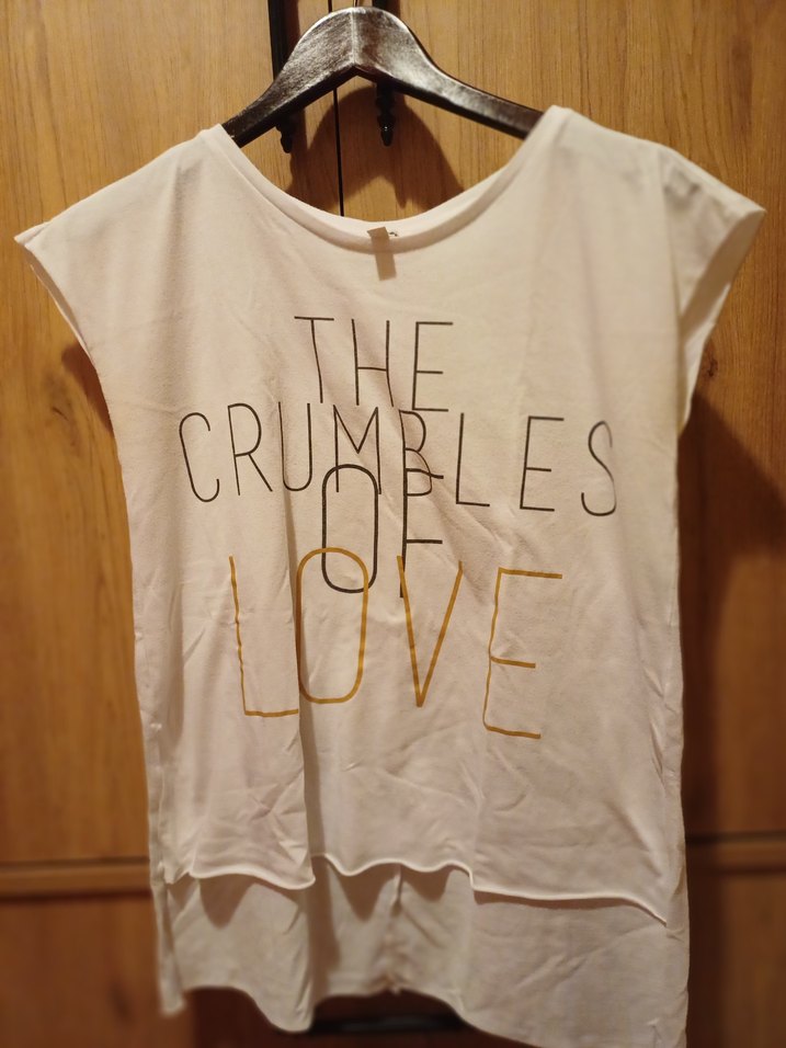 Beyaz keten hamile tişörtü, kısa kollu, salaş kesim ve yuvarlak yaka. Üzerinde 'THE CRUMBLES OF LOVE' yazılı baskı ve fırfır detayları bulunur. Romantik akşamlar için uygun. ❤️