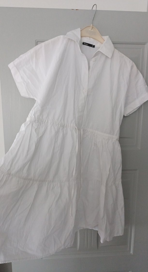 Beyaz keten hamile tunik, kısa kollu ve salaş kesimlidir. Yaka kısmı gömlek tarzı, drapeli ve midi boydadır.