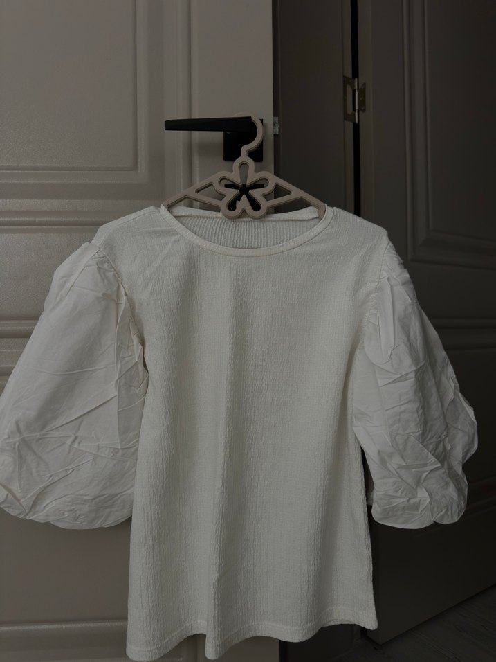 Beyaz keten kumaştan, yuvarlak yakalı ve kısa pileli kollu kadın bluz. Salaş kesimi ve normal boyuyla minimalist sokak stiline uygun, günlük kullanıma ideal.