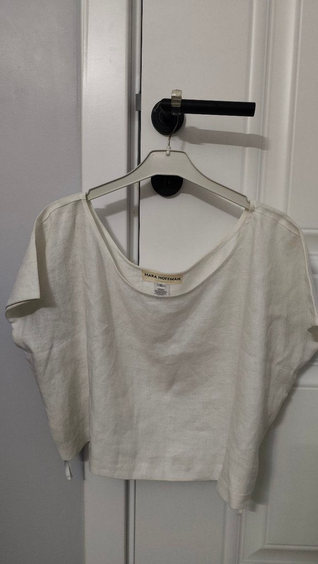 Beyaz keten kumaştan, salaş kesim ve tekne yakalı kısa kollu kadın bluz, minimalist ve bohem tarzda günlük kullanım için uygun.