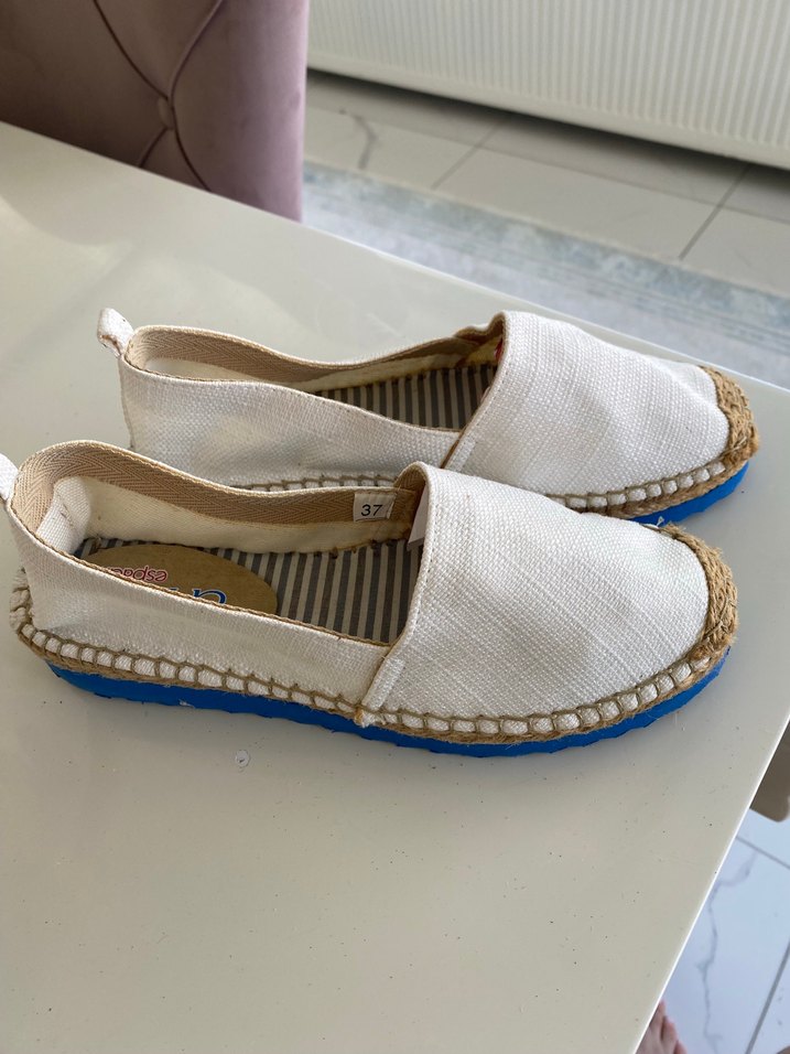 Beyaz keten espadriller, dolgu topuklu ve desensiz tasarımıyla günlük kullanıma uygun, bohem tarzda zahmetsiz şıklık sunar. Hiç kullanılmadı mağaza ürünü kutusuz gönderim marka temsilidir