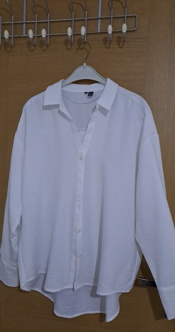 Beyaz keten kumaştan, yakalı ve düğmeli, bol kesim kadın gömlek. Uzun kollu ve midi boy, günlük sokak stiline uygun minimal tasarım.