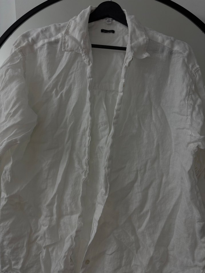 Beyaz keten kadın gömlek, yakalı ve uzun kolludur. Düğmeli, bol kesimdir. Normal midi boyda, parlak ve desensiz tasarıma sahiptir, günlük kullanıma uygundur.