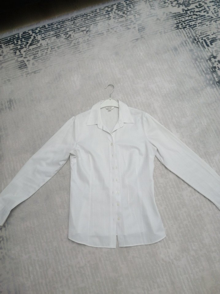 Beyaz keten kumaştan, yakalı ve uzun kollu kadın gömleği. Düğmeli ve dar kalıp, ofis ve günlük kullanıma uygundur. Desensiz, sade tasarım.