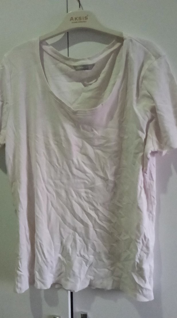 Beyaz keten kumaştan, kısa kollu ve yuvarlak yakalı, normal boyda, rahat kesim kadın tişörtü. Minimalist ve sade tarzda, günlük kullanıma uygun.