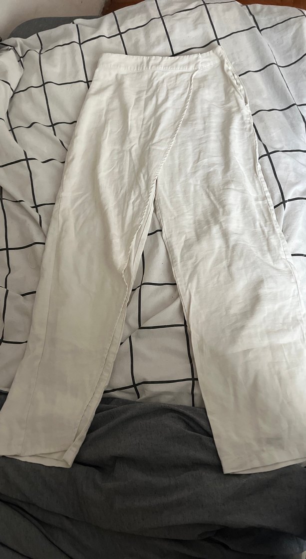 Beyaz Keten Kadın Pantolon arkasında minik lekesi var
