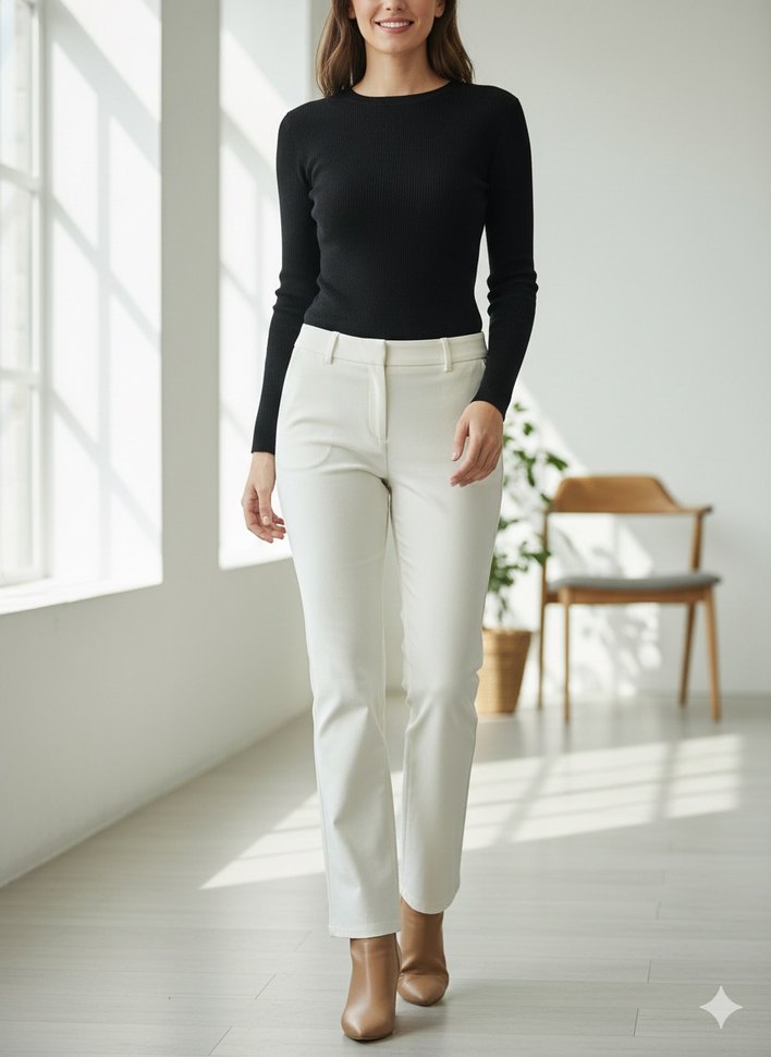 Beyaz dökümlü kumaştan, normal boy midi kesim, regular fit kadın pantolon. Minimalist ve normcore tarzıyla ofis için uygundur, desen içermez.