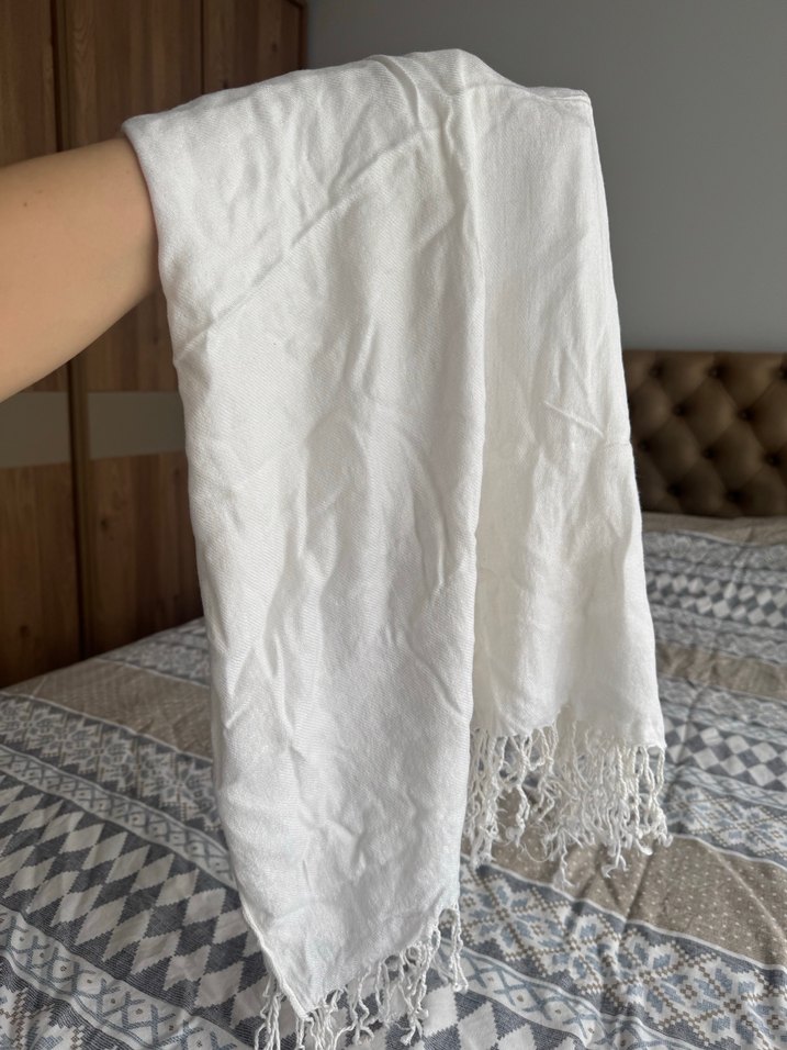 Beyaz keten kumaştan, püsküllü kenarlarıyla bohem ve retro tarzda, rahat bir kadın şalı.