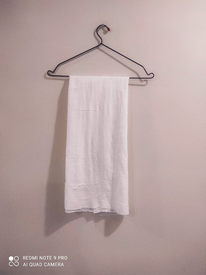 Yumuşak keten kumaştan yapılmış beyaz kadın şal, drapeli tasarımıyla minimalist ve normcore tarzına uygun.