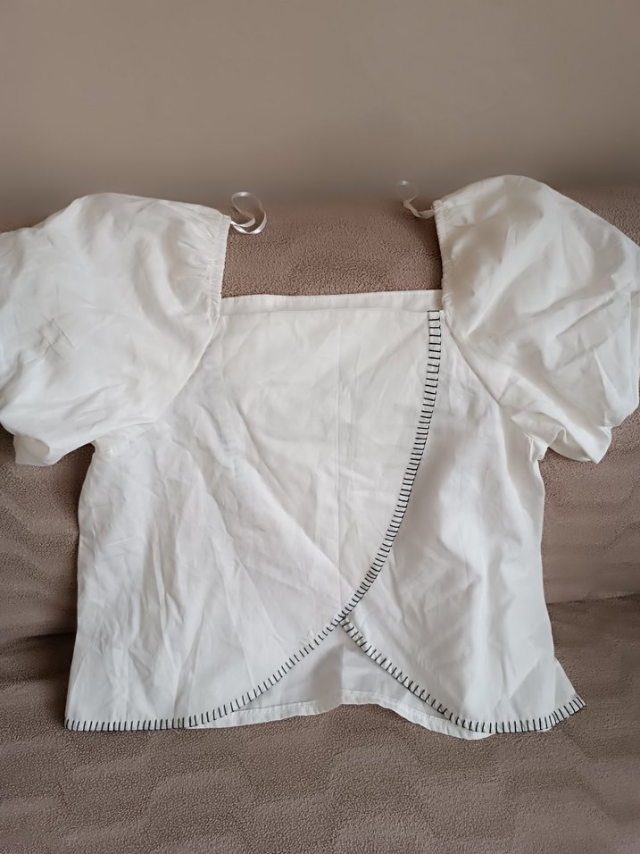 Keten kumaştan, kısa kabarık kollu, straplez yaka beyaz bluz. Rahat kesimli, minimalist bohem tarzda, 146/75A 10-11 yaş