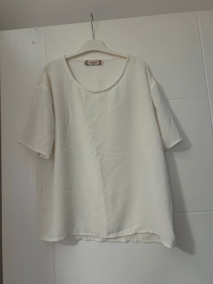 Kısa kollu, yuvarlak yakalı beyaz keten bluz, rahat kesimi ve sade tasarımıyla günlük kullanım için uygundur. Minimalist stil için idealdir.
