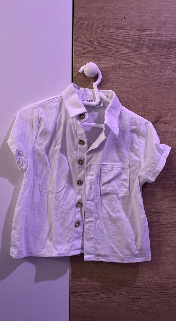 Beyaz keten kumaştan, kısa kollu ve yakalı gömlek. Düğmeli ve ön cepli, rahat kesimiyle günlük sokak stiline uygun.