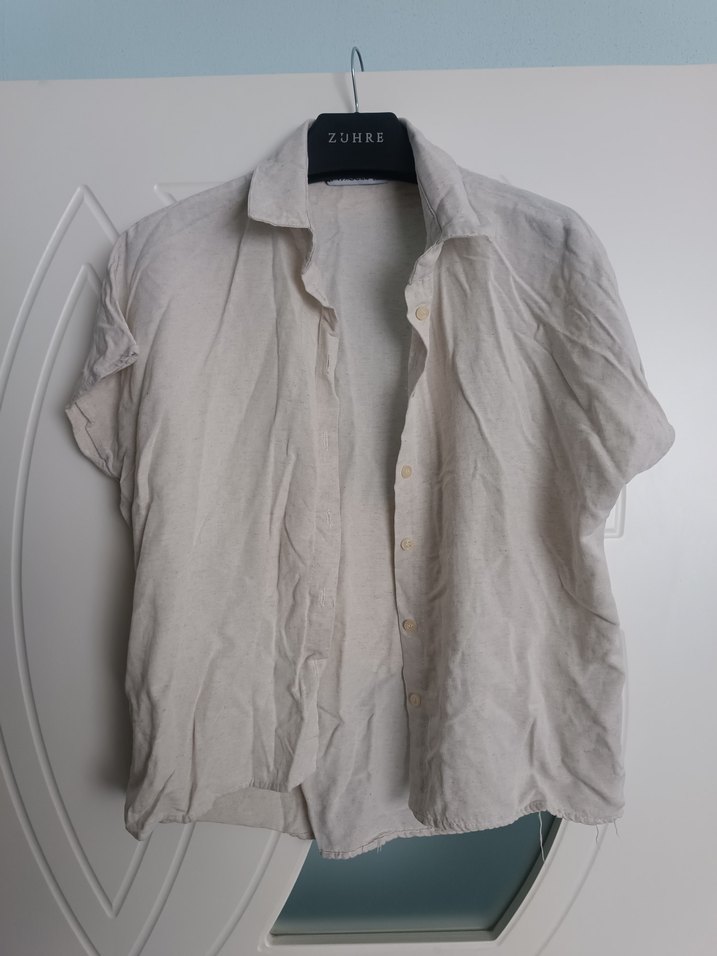 markalı, beyaz keten kumaştan üretilmiş, kısa kollu, yakalı ve düğmeli önü olan salaş kesim gömlek. Minimalist ve günlük kullanıma uygun.