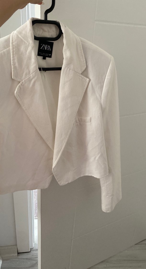 Beyaz keten kumaştan, kısa kollu ve yakası kesik detaylı, düğmeli kadın blazer. Normal boyda, regular fit ve ofis kullanımı için uygun.