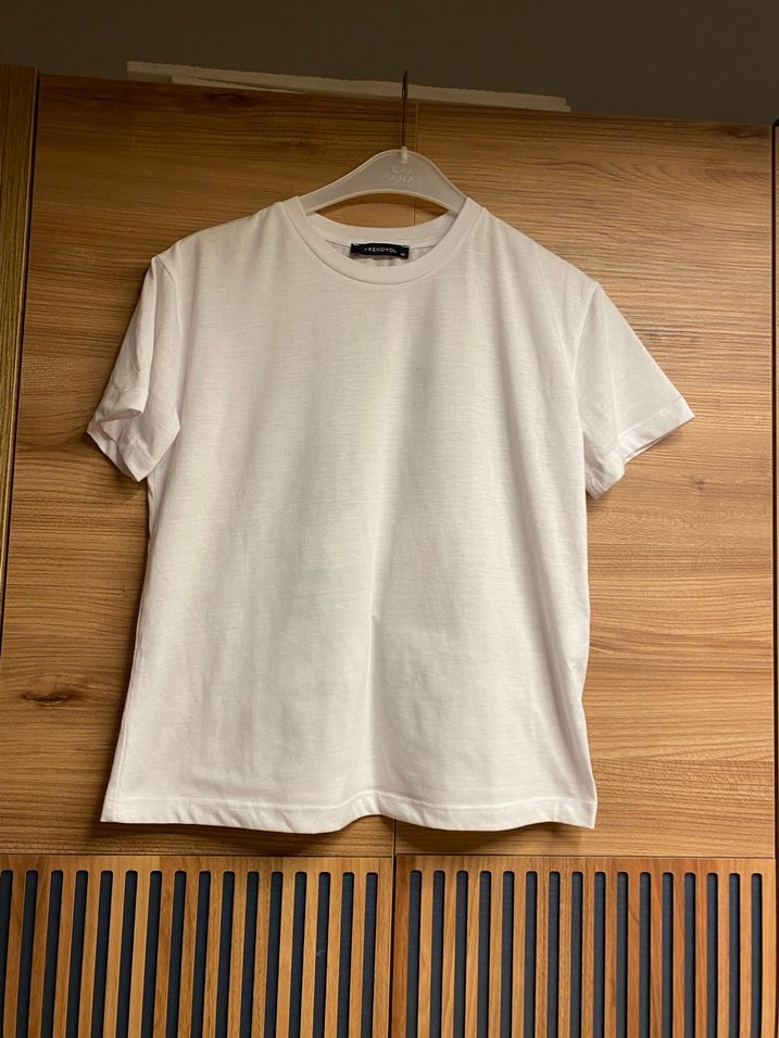 Beyaz keten kumaştan yapılmış, kısa kollu ve yuvarlak yaka salaş kesim tişört, minimalist ve rahat bir sokak stili sunar. Normal midi boyda, desensiz ve günlük kullanıma uygundur.