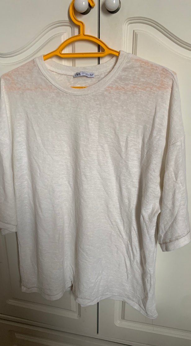Beyaz keten kumaştan, kısa kollu ve yuvarlak yakalı, rahat kesim minimalist ve desensiz tişört. Günlük kullanıma uygun.