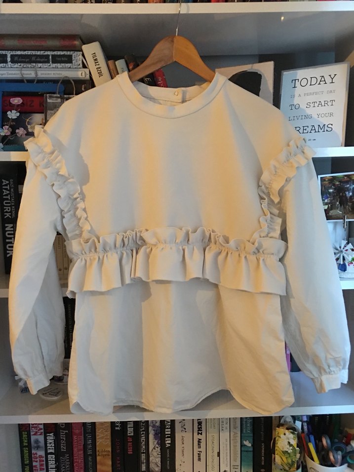 Beyaz keten kumaştan, uzun kollu ve yuvarlak yakalı kız bluzu. Fırfır detaylarıyla sade ve şık bir tasarıma sahiptir.