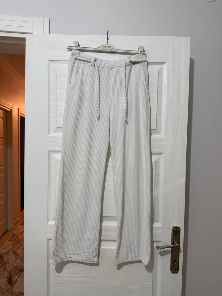 Beyaz keten kumaştan, kuşaklı ve bol kesim midi boy pantolon. Rahat ve nefes alan dokusu günlük kullanıma uygundur.