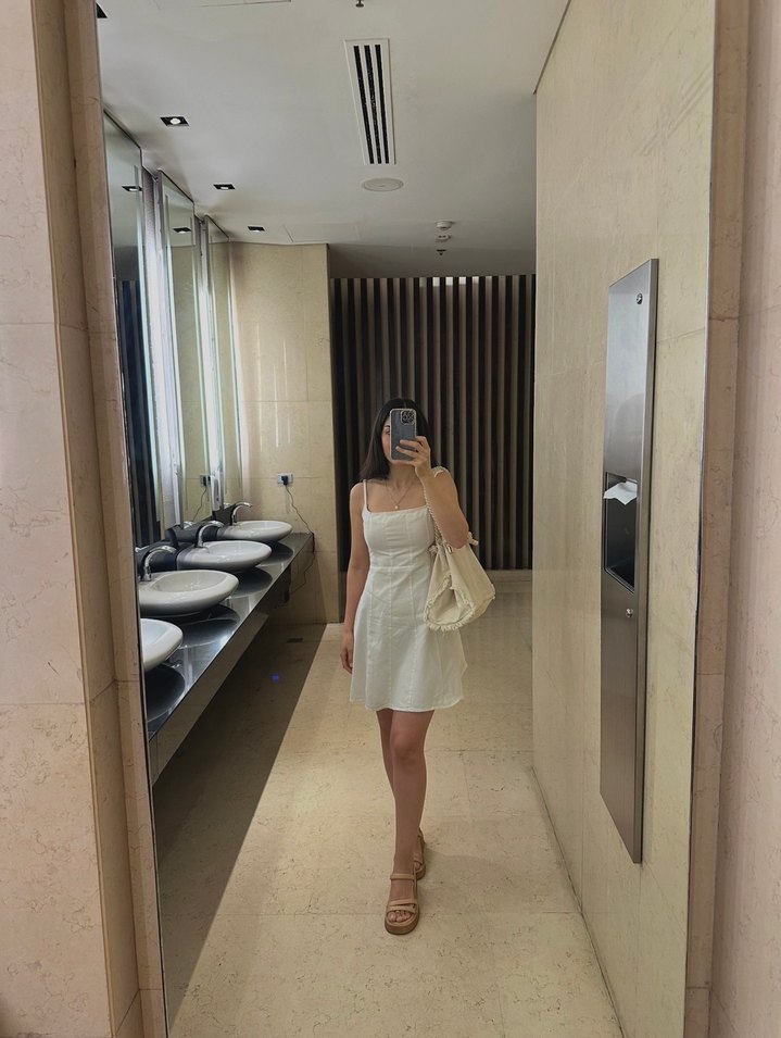 Beyaz keten midi elbise, askılı yakasıyla sade ve şık bir görünüm sunar. Bohem ve minimal tarzda, günlük kullanıma uygundur.