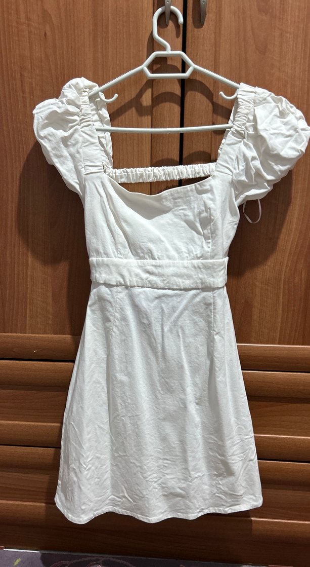 Beyaz keten midi elbise, kabarık kollar ve tekne yaka ile şık ve bohem bir görünüm sunar. Günlük kullanıma uygundur.