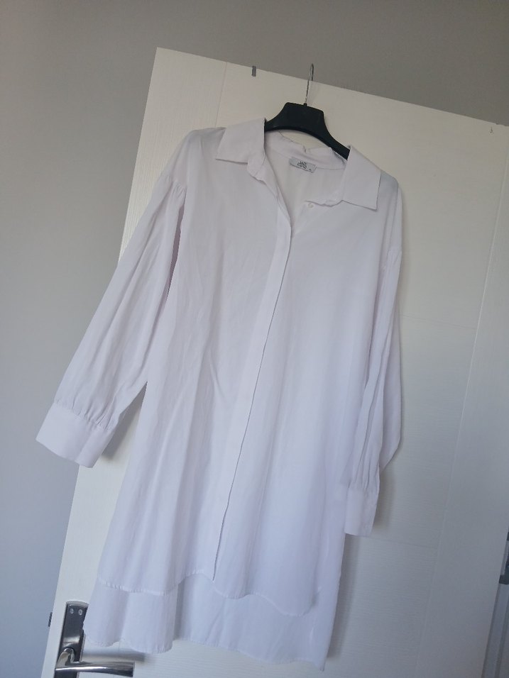 Beyaz keten midi gömlek, yakalı ve düğmeli, uzun kollu, bol kesim. Minimalist tasarım, ofis için uygun.