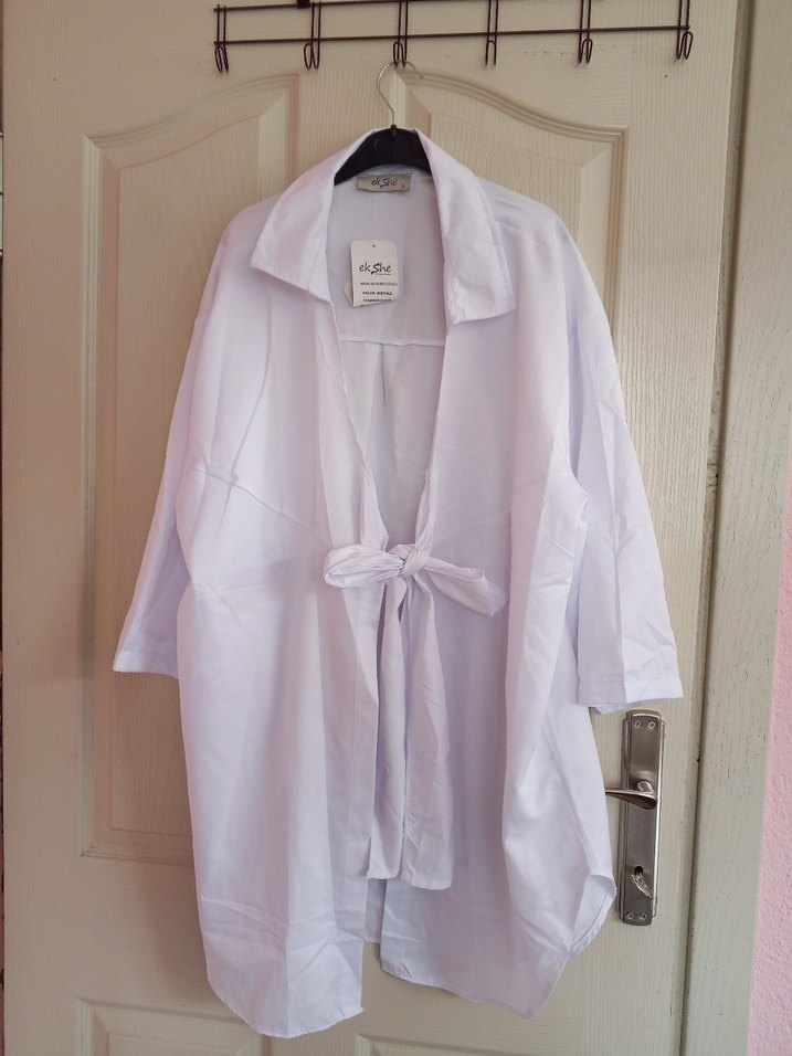 Beyaz Keten Midi Gömlek, Kuşaklı, Uzun Kollu pareo