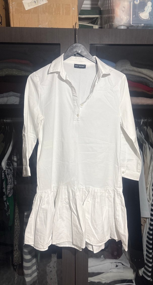 Uzun kollu, yakalı ve düğmeli, bol kesim beyaz keten gömlek elbise. Günlük kullanım için uygun, rahat ve şık.
