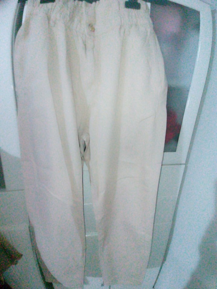 Beyaz keten kumaştan, bol kesim ve drapeli midi kadın pantolonu. Minimalist ve sade tasarımlı, günlük kullanıma uygun.