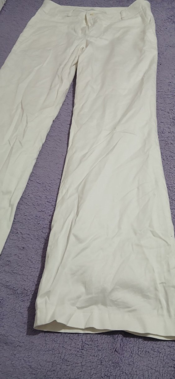 Beyaz keten kumaştan, drapeli ve vücuda oturan kesime sahip midi uzunlukta kadın pantolonu. Minimalist, normcore tarzda dış mekan kullanımı için uygun. boy 95 cm