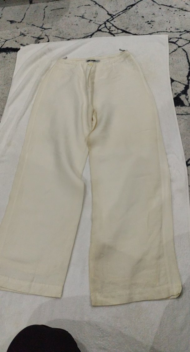 Beyaz keten midi pantolon, rahat kesim ve sade tasarımla günlük kullanıma uygun şık bir seçenek. yaz günleri için muhteşem