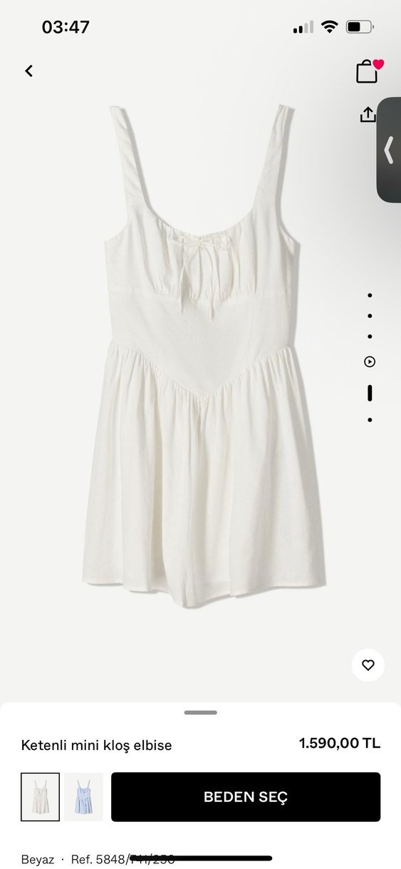 Beyaz keten kumaştan, midi boy, kolsuz, salaş kesim elbise. Boğaz kesimi ve sade tasarımıyla romantik akşamlar için uygun.