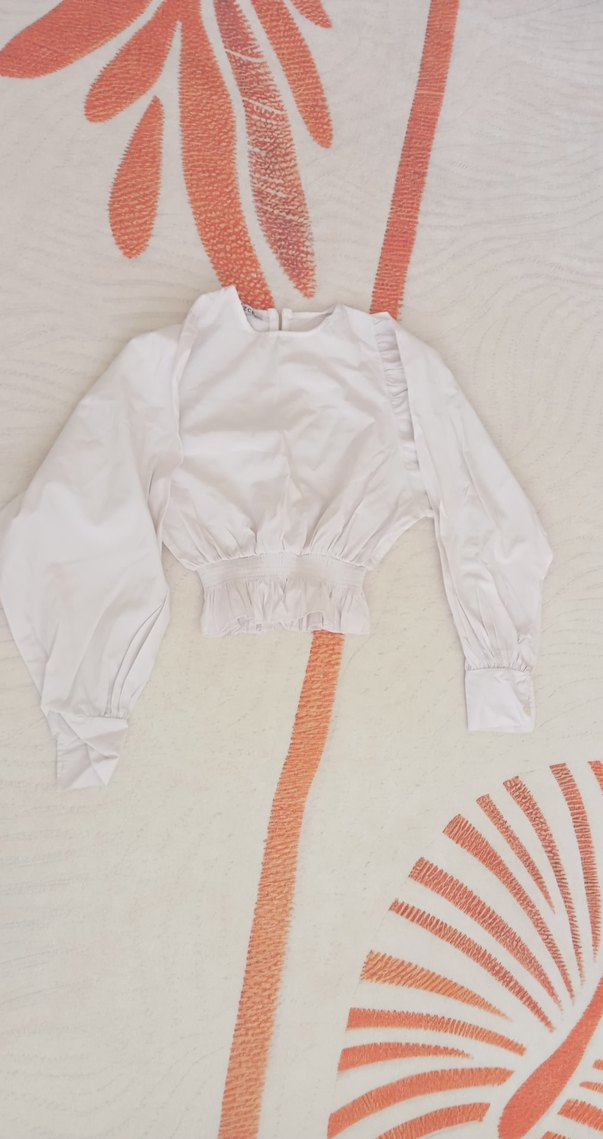 Beyaz keten bluz, uzun kollu ve fırfır detaylıdır. Salaş kesim, yuvarlak yaka ve kısa boy ile minimalist sokak stili için uygundur.