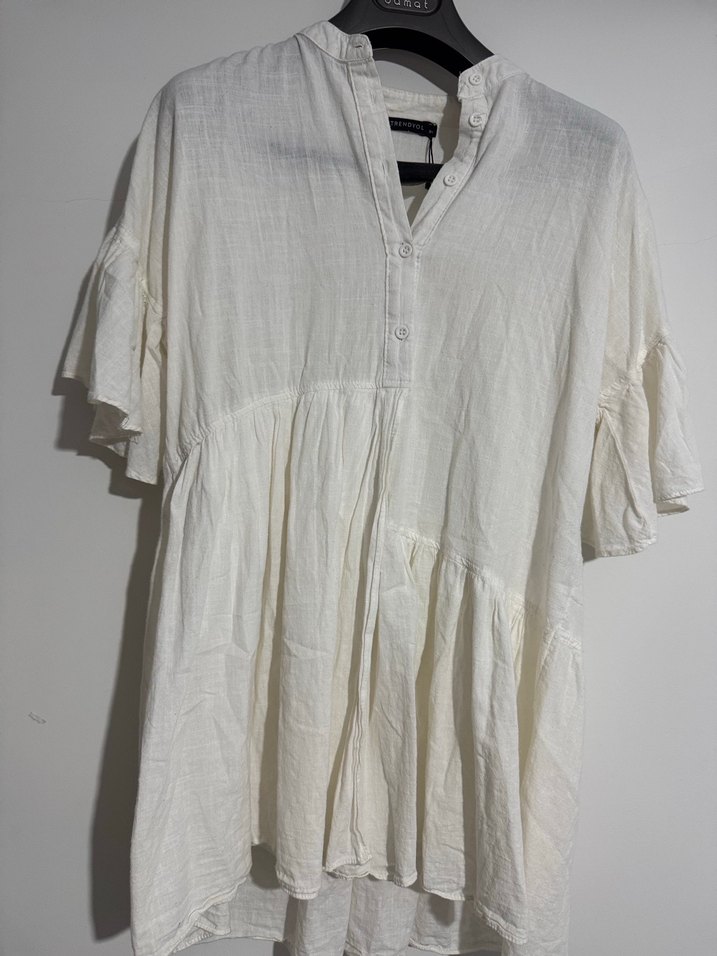 Beyaz keten mini gömlek, kısa fırfırlı kollu ve V yakalı, bol kesimli bohem tarzda.
