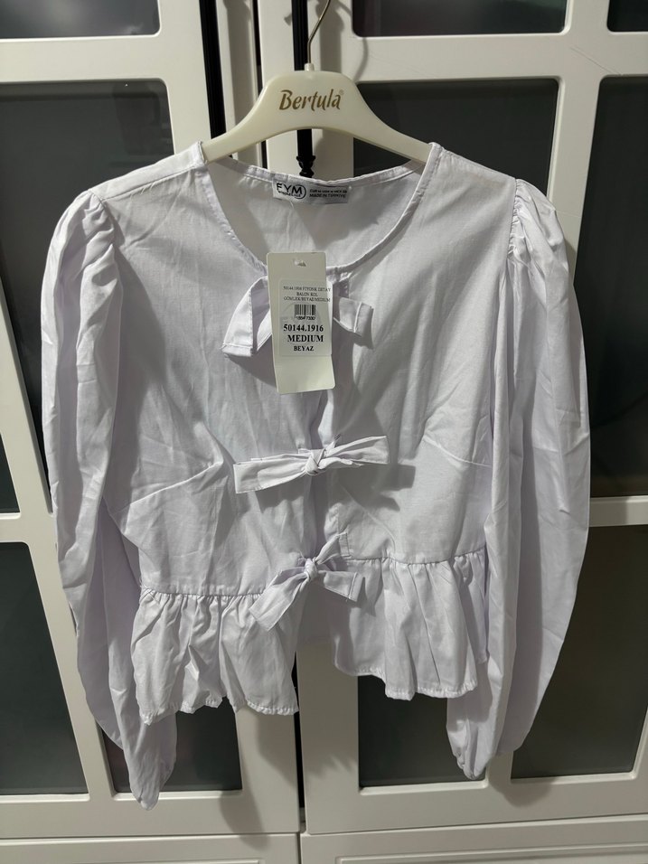Beyaz keten kumaştan, uzun kollu, yuvarlak yakalı, düğmeli ve bol kesim mini kadın gömlek. Sokak tarzı için uygun, Bertula markalı.