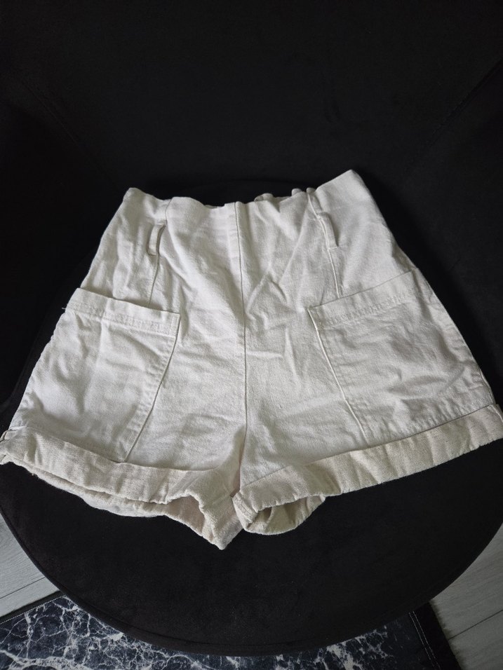 Beyaz keten mini şort, bol kesim ve kısa boy ile günlük kullanıma uygun, zahmetsiz şıklık sağlar. Düz, desensiz ve vintage tarzda.