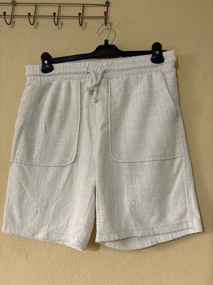 Gevşek kesim, beyaz keten mini şort, lastikli bel ve ön ceplerle günlük kullanıma uygun. Rahat ve şık tasarım.