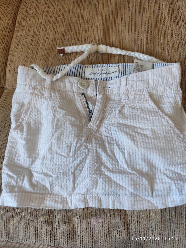 Beyaz keten mini şort, rahat kesim ve fermuarlı ön detaylıdır. Günlük kullanıma uygun bohem tarzda.